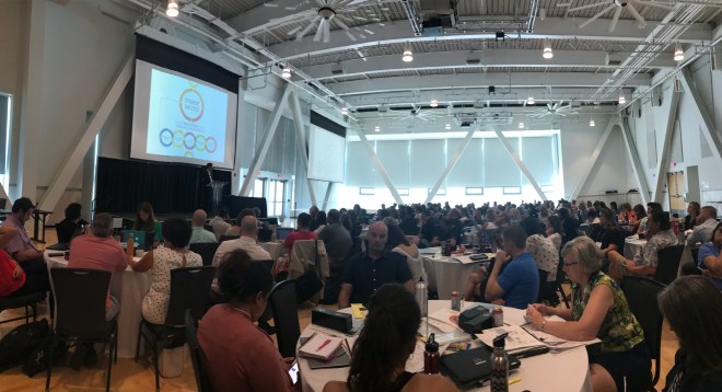 The second session I attended in the afternoon was in the Kingsmill Forum, a fancy round seminar room that looked sort of like a city hall chamber. Here I listened to a panel of speakers talk about Leading the Redesigned Curriculum. After an overview discussion about how to effectively lead change, we delved deep into 4 different examples – 2 from elementary and 2 from secondary – of school leaders examples of employing new curriculum. The secondary examples, which were most relevant to me were 1) Aaron Davis, VSB Director of Instruction, speaking about Templeton’s STEM Program, and 2) Pedro Da Silva, also a VSB Director of Instruction, sharing the certificate program used at John Oliver Secondary. During this session I also had a great chat with one of my family group members, Mike Moloney, VP at Panorama Ridge Secondary, about using of course outlines as one way to gauge successful implementation of new curriculum. If teachers are successfully using the new curriculum, it should be evident in what they’re assessing, which would ideally also be described in their outlines.