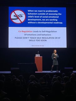 Dr. Delahooke, in her empathic approach, suggested that challenging student behaviours are an adaption to autonomic nervous system cues, and that there is a difference between wilful misbehaviour and a subconscious adaptation. The behaviours are only the metaphorical tip of the iceberg, and that it’s our responsibility in caring for our children to delve beyond the surface, seek to understand, and support students as best we can. I also appreciated Dr. Delahooke’s notion that self-regulation needs to begin first with co-regulation; that the external interaction between students in your classroom/building needs to be upskilled and regulated before attention can be turned inwards for students.