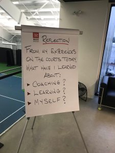 In the afternoon this understanding was further refined as we hit the tennis court to start using a coaching model for providing feedback.  Chis kicked off the session with an intro to tennis pro turned philosopher Tim Gallwey.  Gallwey is the author of The Inner Game of Tennis, a psychological examination of sport performance phenomenon.  In it, he describes two selves: Self 1, which is analytical, ego-driven and gets in the way of Self 2, which is more unconscious, intuitive and physical.  When an athlete is ‘in the zone’, they are fully realizing their Self 2 potential.  The secret to the Inner Game is really to find how to get Self 1 out of the way of Self 2.