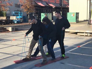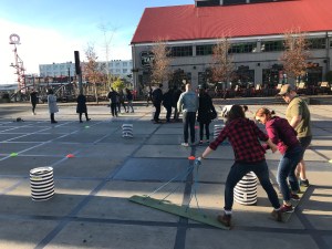Our culminating activity for the day was an outdoor competitive group challenge.  We were divided into 4 teams, each with a coach to help guide using the Question Funnel, and supercoach to employ The Feedback Model with the coach.  Our team challenge was a timed obstacle course, and brought together many of the concepts we had already learned, including having the coachees (the team) determine their own goals.  We were encouraged to practice our questioning techniques, rather than telling people what to do, and were reminded that leaders are able to check their emotions by grasping themselves, grasping their team, and finally grasping the task at hand.